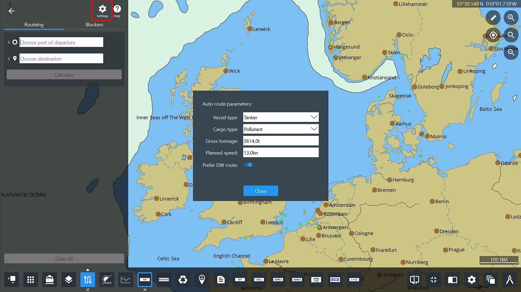 Select a required location in the port and you will get a complete route suggestion, berth to berth.