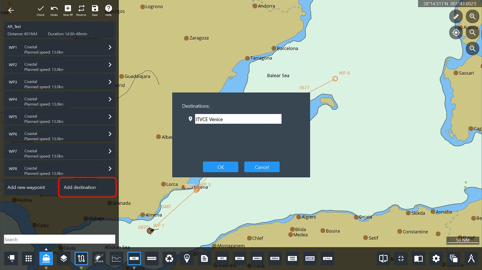 Note: Any route produced by the Auto Routeing module is a SUGGESTION ONLY and requires further route and passage planning analysis. It is the mariner’s sole responsibility to adjust the route to match the vessel’s characteristics, company policies and regulations; in order to validate the route towards the latest Chart and Publication updates and navigational warnings.